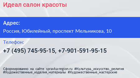 Для связи с организацией воспользуйтесь номером телефона: +7 (495) 745-95-15, +7-901-591-95-15. Ежедневно с 10:00 до 21:00, вы можете обратиться в эту организацию.