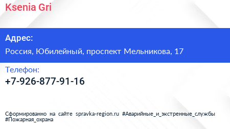 Ksenia Gri по адресу 17, проспект Мельникова, Родионово, микрорайон ИКЕА, Планерная, Химки, городской округ Химки, Московская область, Центральный федеральный округ, 141501, Россия в дальнейшем Организация, размещена в следующих категориях: