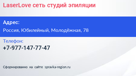 LaserLove, сеть студий эпиляции по адресу Юридическое бюро "Друг", 78, Молодёжная улица, Новокуркино, район Куркино, Химки, городской округ Химки, Московская область, Центральный федеральный округ, 141501, Россия в дальнейшем Организация, размещена в следующих категориях: