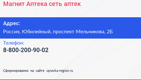 Магнит Аптека, сеть аптек по адресу Магнит, 2Б, проспект Мельникова, Родионово, Новокуркино, Новые Химки, Химки, городской округ Химки, Московская область, Центральный федеральный округ, 141501, Россия в дальнейшем Организация, размещена в следующих категориях: