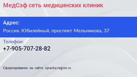 МедСэф, сеть медицинских клиник по адресу 37, проспект Мельникова, Родионово, микрорайон ИКЕА, Планерная, Химки, городской округ Химки, Московская область, Центральный федеральный округ, 141501, Россия в дальнейшем Организация, размещена в следующих категориях:
