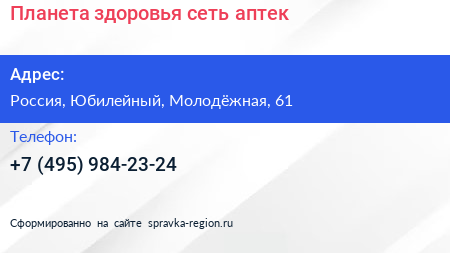 Планета здоровья, сеть аптек по адресу Планета здоровья, 61, Молодёжная улица, Родионово, Новокуркино, Новые Химки, Химки, городской округ Химки, Московская область, Центральный федеральный округ, 141501, Россия в дальнейшем Организация, размещена в следующих категориях: