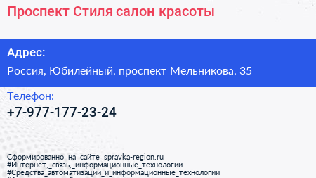 Проспект Стиля, салон красоты по адресу 35, проспект Мельникова, Родионово, микрорайон ИКЕА, Планерная, Химки, городской округ Химки, Московская область, Центральный федеральный округ, 141501, Россия в дальнейшем Организация, размещена в следующих категориях: