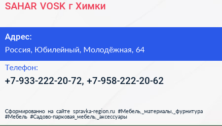 SAHAR & VOSK, г. Химки по адресу Ozon, 64, Молодёжная улица, Родионово, Новокуркино, Новые Химки, Химки, городской округ Химки, Московская область, Центральный федеральный округ, 141501, Россия в дальнейшем Организация, размещена в следующих категориях: