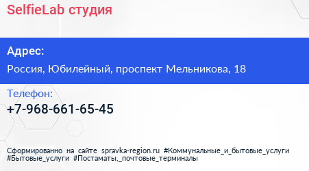 SelfieLab, студия по адресу 18, проспект Мельникова, Родионово, Новокуркино, Новые Химки, Химки, городской округ Химки, Московская область, Центральный федеральный округ, 141410, Россия в дальнейшем Организация, размещена в следующих категориях: