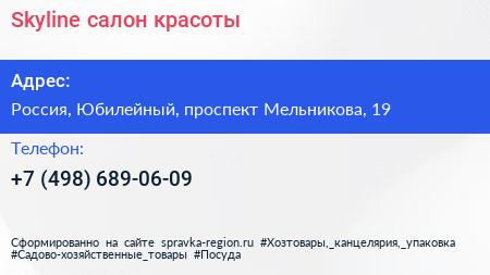 Skyline, салон красоты по адресу 19, проспект Мельникова, Родионово, микрорайон ИКЕА, Планерная, Химки, городской округ Химки, Московская область, Центральный федеральный округ, 141501, Россия в дальнейшем Организация, размещена в следующих категориях: