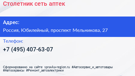 Столетник, сеть аптек по адресу 27, проспект Мельникова, Родионово, микрорайон ИКЕА, Планерная, Химки, городской округ Химки, Московская область, Центральный федеральный округ, 141501, Россия в дальнейшем Организация, размещена в следующих категориях: