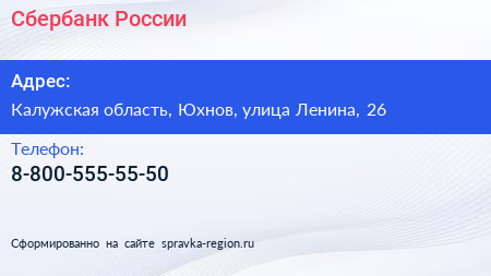 Сбербанк России по адресу Калужская область, Юхнов, улица Ленина, 26 в дальнейшем Организация, размещена в следующих категориях: