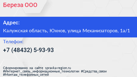 Береза, ООО по адресу Калужская область, Юхнов, улица Механизаторов, 1а/1 в дальнейшем Организация, размещена в следующих категориях: