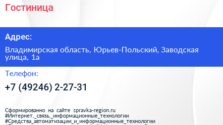 Гостиница по адресу Владимирская область, Юрьев-Польский, Заводская улица, 1а в дальнейшем Организация, размещена в следующих категориях: