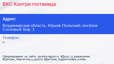 ВКС -Кантри, гостиница по адресу Владимирская область, Юрьев-Польский, посёлок Сосновый Бор, 1 в дальнейшем Организация, размещена в следующих категориях: