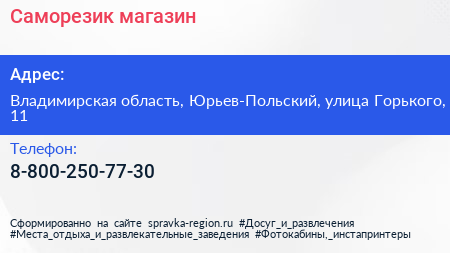 Саморезик, магазин по адресу Владимирская область, Юрьев-Польский, улица Горького, 11 в дальнейшем Организация, размещена в следующих категориях: