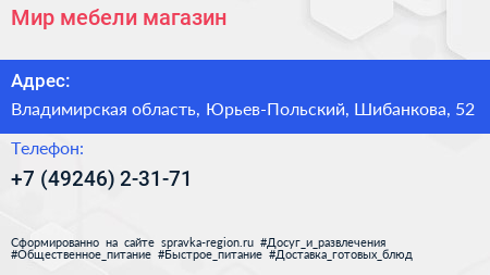 Мир мебели, магазин по адресу Владимирская область, Юрьев-Польский, Шибанкова, 52 в дальнейшем Организация, размещена в следующих категориях: