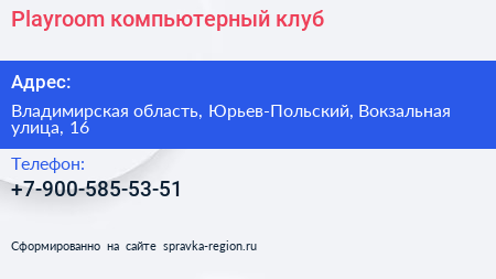 Playroom, компьютерный клуб по адресу Владимирская область, Юрьев-Польский, Вокзальная улица, 16 в дальнейшем Организация, размещена в следующих категориях: