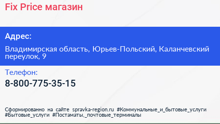 Fix Price, магазин по адресу Владимирская область, Юрьев-Польский, Каланчевский переулок, 9 в дальнейшем Организация, размещена в следующих категориях: