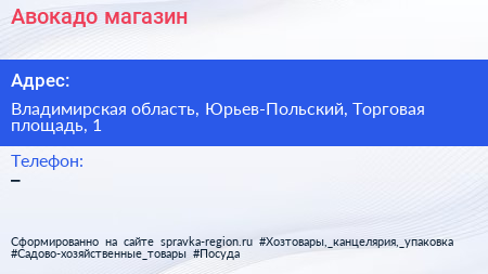 Авокадо, магазин по адресу Владимирская область, Юрьев-Польский, Торговая площадь, 1 в дальнейшем Организация, размещена в следующих категориях:
