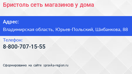 Бристоль, сеть магазинов у дома по адресу Владимирская область, Юрьев-Польский, Шибанкова, 88 в дальнейшем Организация, размещена в следующих категориях: