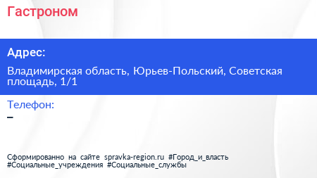 Гастроном по адресу Владимирская область, Юрьев-Польский, Советская площадь, 1/1 в дальнейшем Организация, размещена в следующих категориях: