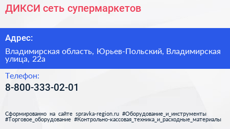 ДИКСИ, сеть супермаркетов по адресу Владимирская область, Юрьев-Польский, Владимирская улица, 22а в дальнейшем Организация, размещена в следующих категориях:
