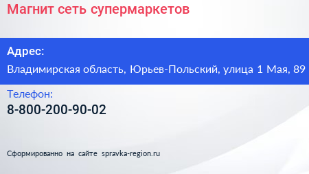 Магнит, сеть супермаркетов по адресу Владимирская область, Юрьев-Польский, улица 1 Мая, 89 в дальнейшем Организация, размещена в следующих категориях: