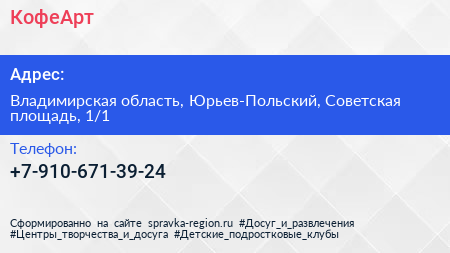 КофеАрт по адресу Владимирская область, Юрьев-Польский, Советская площадь, 1/1 в дальнейшем Организация, размещена в следующих категориях:
