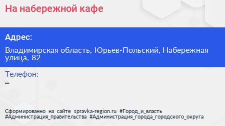 На набережной, кафе по адресу Владимирская область, Юрьев-Польский, Набережная улица, 82 в дальнейшем Организация, размещена в следующих категориях: