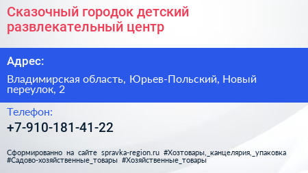 Сказочный городок, детский развлекательный центр по адресу Владимирская область, Юрьев-Польский, Новый переулок, 2 в дальнейшем Организация, размещена в следующих категориях: