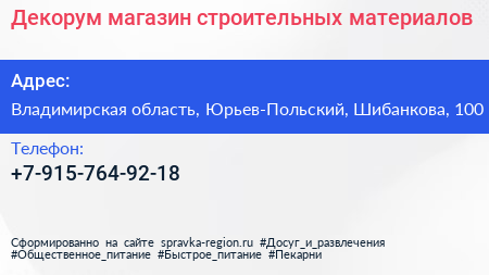 Декорум, магазин строительных материалов по адресу Владимирская область, Юрьев-Польский, Шибанкова, 100 в дальнейшем Организация, размещена в следующих категориях: