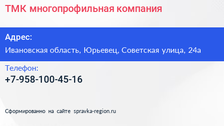 ТМК, многопрофильная компания по адресу Ивановская область, Юрьевец, Советская улица, 24а в дальнейшем Организация, размещена в следующих категориях:
