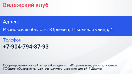 Вилежский клуб по адресу Ивановская область, Юрьевец, Школьная улица, 1 в дальнейшем Организация, размещена в следующих категориях: