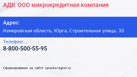 АДК, ООО, микрокредитная компания по адресу Кемеровская область, Юрга, Строительная улица, 33 в дальнейшем Организация, размещена в следующих категориях: