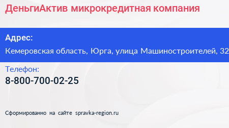 ДеньгиАктив, микрокредитная компания по адресу Кемеровская область, Юрга, улица Машиностроителей, 32 в дальнейшем Организация, размещена в следующих категориях: