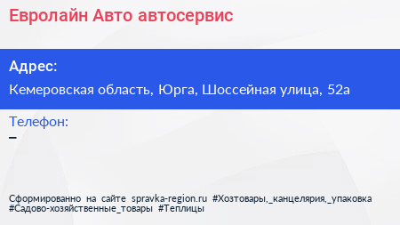 Евролайн-Авто, автосервис по адресу Кемеровская область, Юрга, Шоссейная улица, 52а в дальнейшем Организация, размещена в следующих категориях: