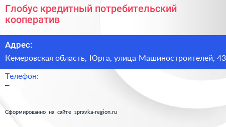 Глобус, кредитный потребительский кооператив по адресу Кемеровская область, Юрга, улица Машиностроителей, 43 в дальнейшем Организация, размещена в следующих категориях: