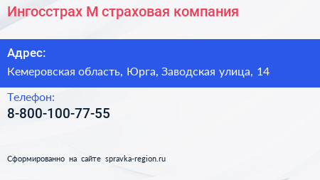 Ингосстрах-М, страховая компания по адресу Кемеровская область, Юрга, Заводская улица, 14 в дальнейшем Организация, размещена в следующих категориях: