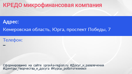 КРЕДО, микрофинансовая компания по адресу Кемеровская область, Юрга, проспект Победы, 7 в дальнейшем Организация, размещена в следующих категориях: