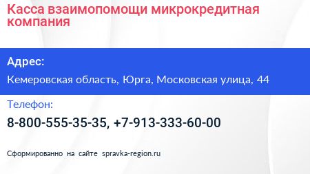 Касса взаимопомощи, микрокредитная компания по адресу Кемеровская область, Юрга, Московская улица, 44 в дальнейшем Организация, размещена в следующих категориях: