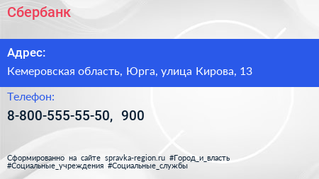 Сбербанк по адресу Кемеровская область, Юрга, улица Кирова, 13 в дальнейшем Организация, размещена в следующих категориях: