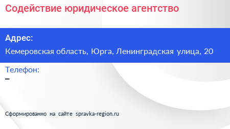 Содействие, юридическое агентство по адресу Кемеровская область, Юрга, Ленинградская улица, 20 в дальнейшем Организация, размещена в следующих категориях: