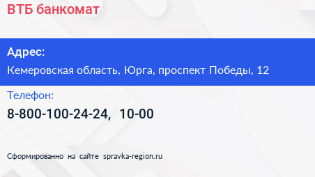 ВТБ, банкомат по адресу Кемеровская область, Юрга, проспект Победы, 12 в дальнейшем Организация, размещена в следующих категориях: