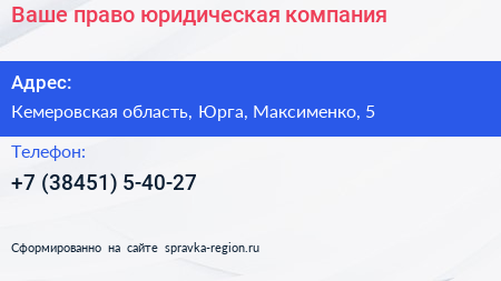 Ваше право, юридическая компания по адресу Кемеровская область, Юрга, Максименко, 5 в дальнейшем Организация, размещена в следующих категориях: