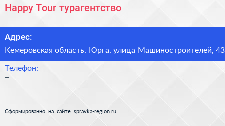 Happy Tour, турагентство по адресу Кемеровская область, Юрга, улица Машиностроителей, 43 в дальнейшем Организация, размещена в следующих категориях: