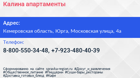 Калина, апартаменты по адресу Кемеровская область, Юрга, Московская улица, 4а в дальнейшем Организация, размещена в следующих категориях: