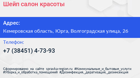 Шейп, салон красоты по адресу Кемеровская область, Юрга, Волгоградская улица, 26 в дальнейшем Организация, размещена в следующих категориях: