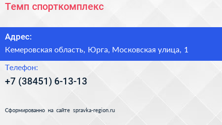 Темп, спорткомплекс по адресу Кемеровская область, Юрга, Московская улица, 1 в дальнейшем Организация, размещена в следующих категориях: