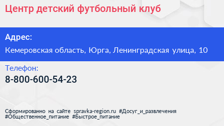 Центр, детский футбольный клуб по адресу Кемеровская область, Юрга, Ленинградская улица, 10 в дальнейшем Организация, размещена в следующих категориях: