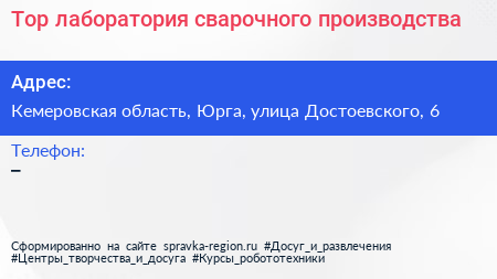 Тор, лаборатория сварочного производства по адресу Кемеровская область, Юрга, улица Достоевского, 6 в дальнейшем Организация, размещена в следующих категориях: