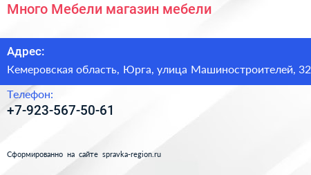 Много Мебели, магазин мебели по адресу Кемеровская область, Юрга, улица Машиностроителей, 32 в дальнейшем Организация, размещена в следующих категориях: