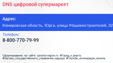 DNS, цифровой супермаркет по адресу Кемеровская область, Юрга, улица Машиностроителей, 32 в дальнейшем Организация, размещена в следующих категориях: