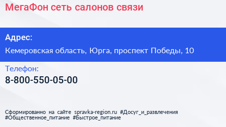 МегаФон, сеть салонов связи по адресу Кемеровская область, Юрга, проспект Победы, 10 в дальнейшем Организация, размещена в следующих категориях: